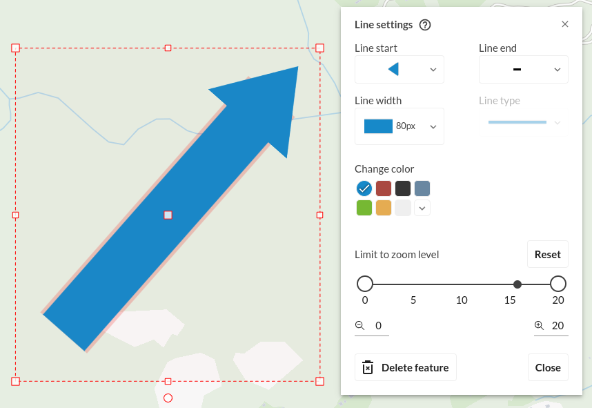 Beim Bearbeiten einer vorhandenen Linie können Knoten durch Ziehen hinzugefügt werden. Bestehende Knoten können durch Ziehen geändert werden. Mit einem Klick auf einen selektierten Knoten kann der Knoten gelöscht werden.