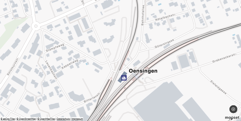 Wenn Sie einen Standard-Plan über die DIDOK-Nummer aufrufen, prüft mapset, ob es bereits eine manuell erstellte Vorlage für den Bahnhof gibt. Wenn keine Vorlage gefunden wird, dann zeigt mapset automatisch den Bahnhof auf der Basiskarte an. Sie können somit für alle Bahnhöfe einen Plan abrufen und müssen nur bei den Bahnhöfen, die es erfordern, noch von Hand Ergänzungen in die Karte einzeichnen.