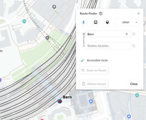 Wenn das Route-Finder-Popup geöffnet wird, wählen Sie zuerst ein Verkehrsmittel aus. Die Haupt-Verkehrsmittel (Fuss, Zug, Bus) verfügen über spezielle Tasten, während mehrere andere Verkehrsmittel aus einem Dropdown-Menü ausgewählt werden können. Durch das Umschalten zwischen Verkehrsmitteln wird jeweils die aktuelle Route gelöscht und eine neue gestartet.