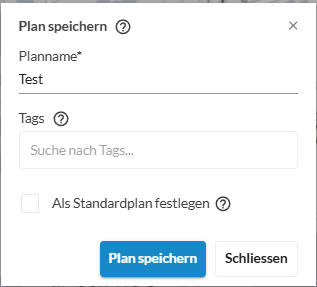 Klicken Sie auf diesen Text, um einen neuen Plannamen einzugeben. Ein Spinner und Bestätigungsmeldung neben dem Texteingabefeld zeigt an, dass der Name gespeichert wurde. Alternativ kann über das Speichern-Tool aus der Seitenleiste ein Dialog-Fenster geöffnet werden, wo in einem Texteingabefeld ebenfalls der Planname gesetzt bzw. aktualisiert werden kann.